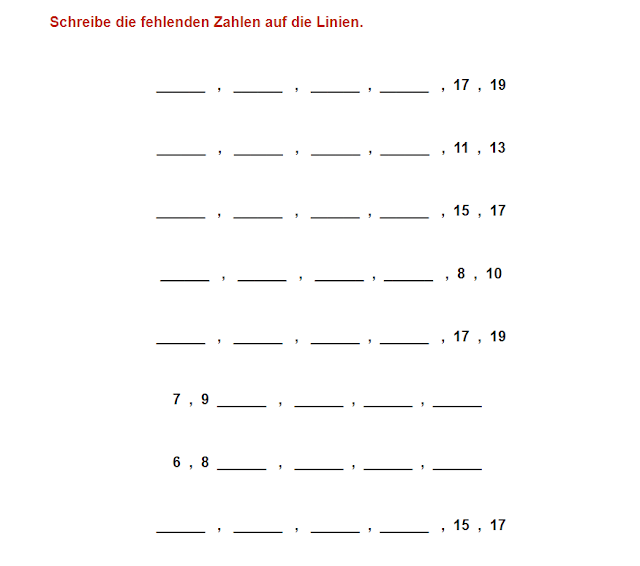 Hier finden Sie Arbeitsblätter mit Matheaufgaben für die 1. Klasse Grundschule. Die Arbeitsblätter sind nach Themen geordnet: Nummern lernen, Addition und Subtraktion mit oder ohne Bilder, Größenvergleich, Muster zeichnen und Geometrie. Die Arbeitsblätter werden zufällig generierte, jedes Mal, wenn Sie unten auf die hyperlinks klicken, außer wenn sie im PDF-layout sind. Für ein neues, anderes Arbeitsblatt: Drücken Sie auf 'Aktualisieren' in Ihrem Browser, um die Seite zu aktualisieren.
